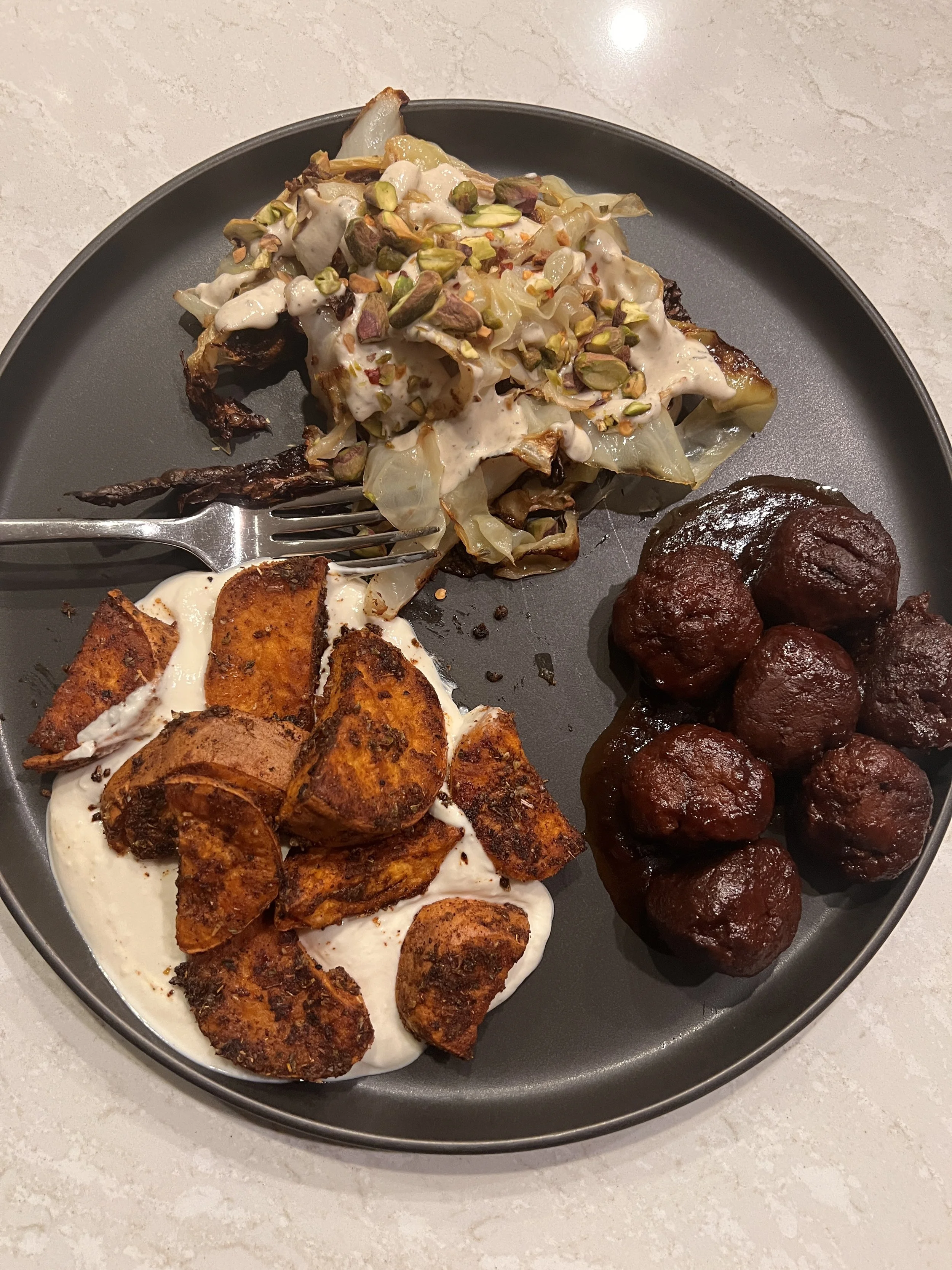 Chicken meatballs + sweet potatoes & honey goat cheese + roasted cabbage