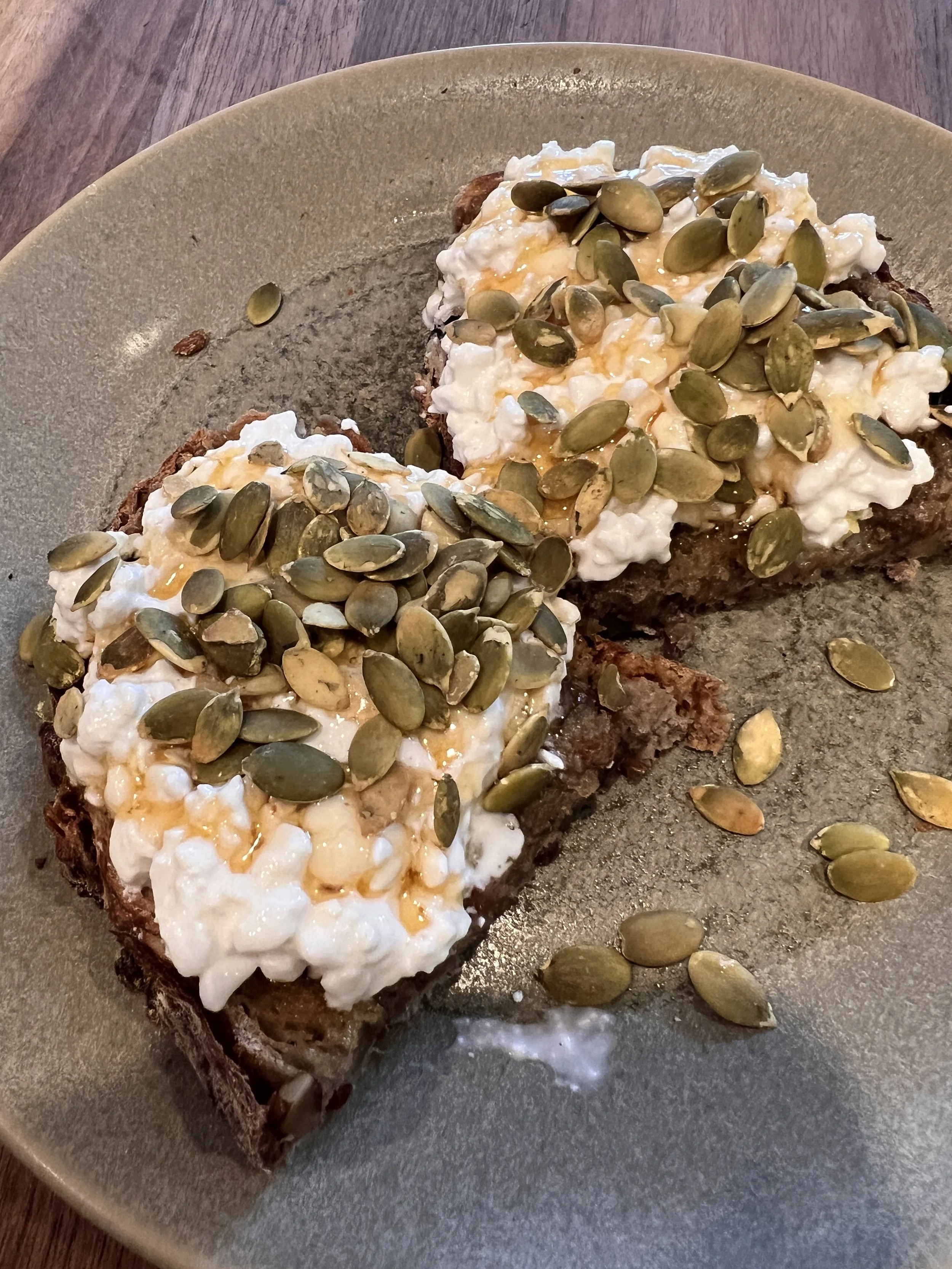 Cottage cheese on toast with honey and pumpkin seeds