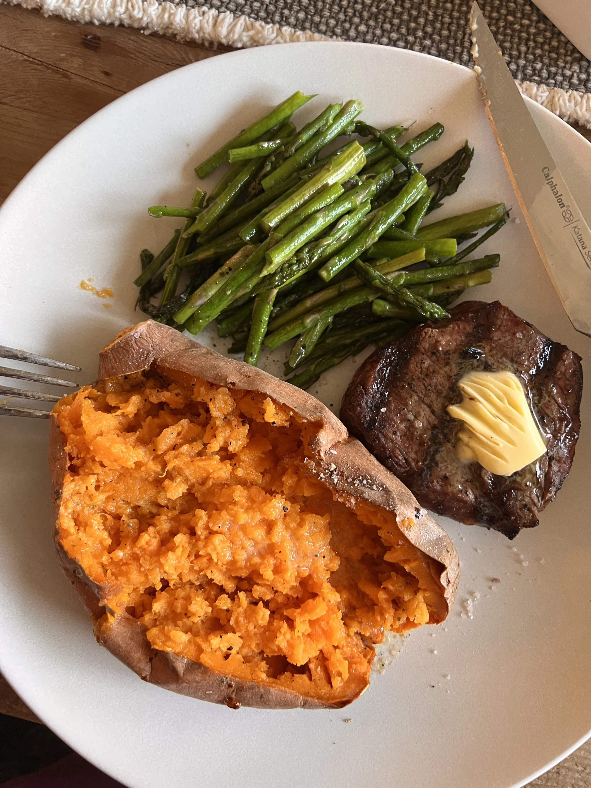 Grass fed filet + butter, sweet potato and sautéed asparagus