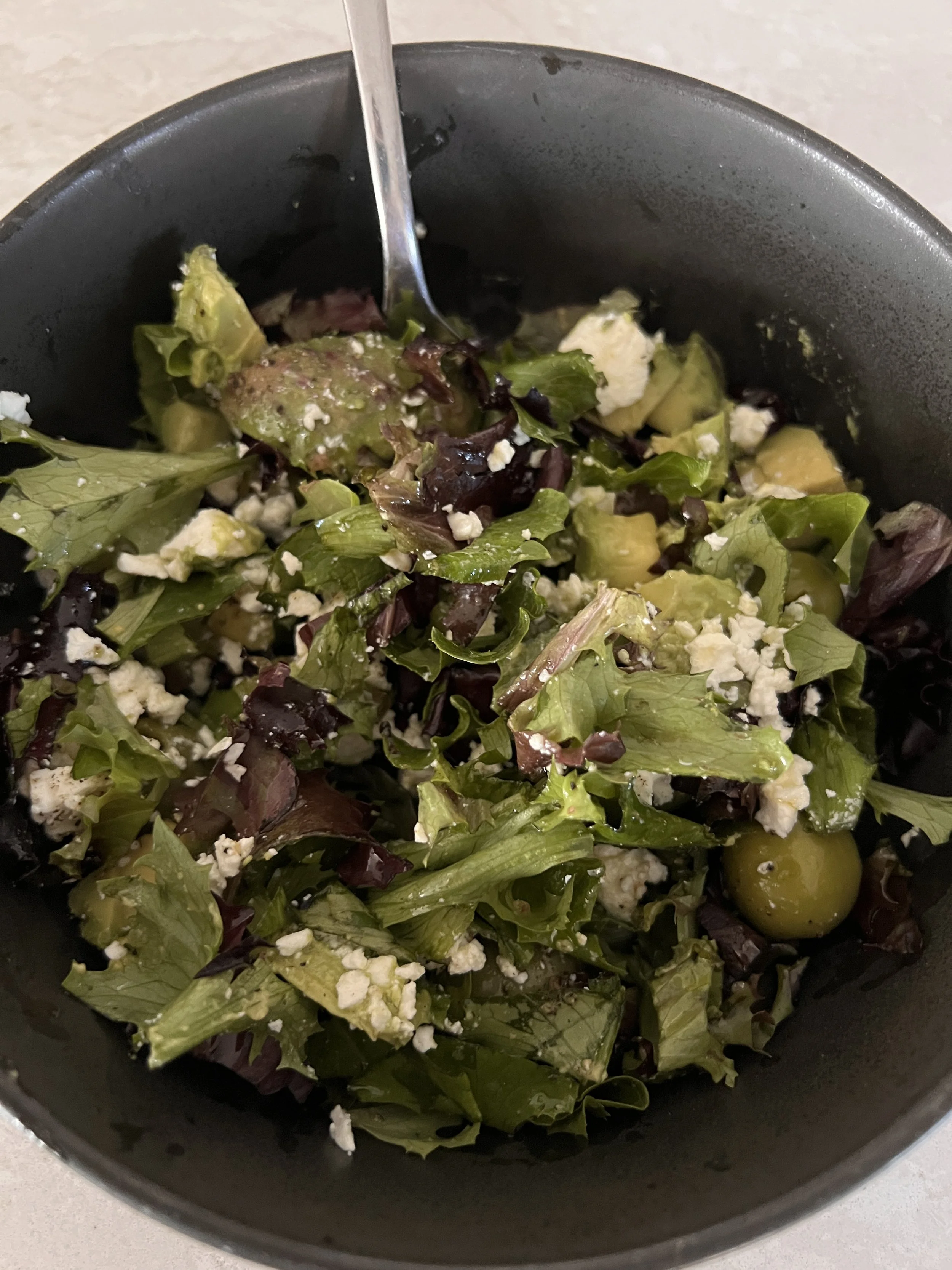 Baby romaine, avocado and olives + feta + olive oil/salt/pepper